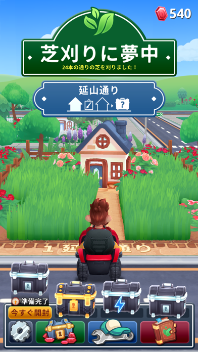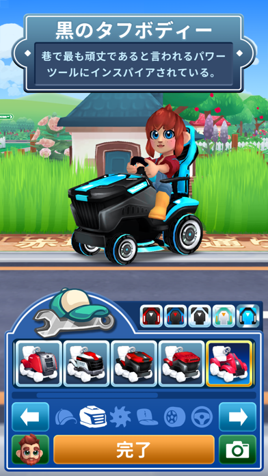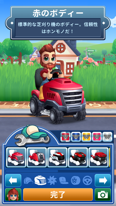 - キャラやカートの見た目もカスタマイズ可能。おしゃれな芝刈り職人に