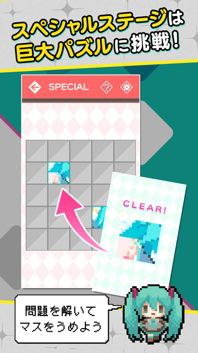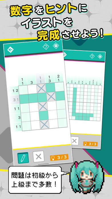 初音ミクやボーカロイドたちのイラストを楽しめるロジックパズル。ロジックを完成させるたびに、ミクやルカたちのさまざまなイラストが見られるようになります。マス数ごとに3段階の難易度が選べるので、初心者でも安心です。