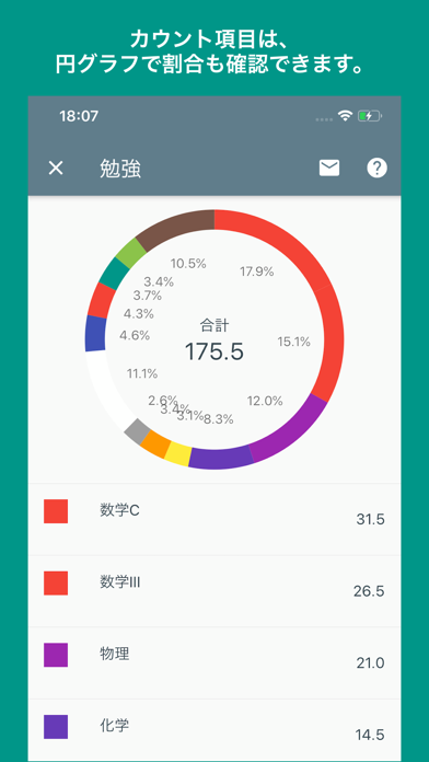 - カウントの計上結果は円グラフで表示できる。比較や検討もしやすく