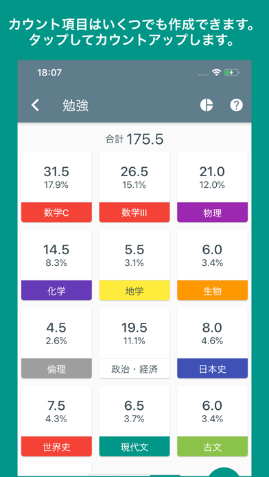 項目をタップすると数が増減し、あわせて割合も変化します。「+」ボタンを押した状態なら増加、「-」ボタンを押した状態なら減少。1タップにつき1増える、5増えるなど増減幅は自由に設定できます。