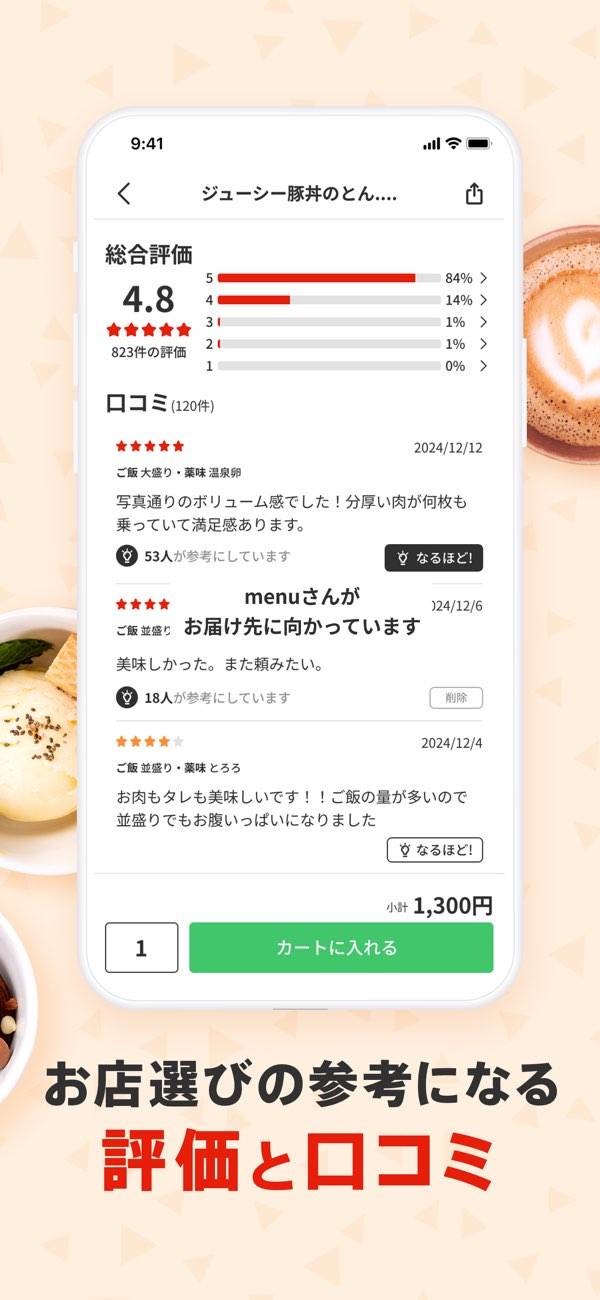 メニューごとのレビューを参考に、気になるあのお店の料理を注文してみませんか。