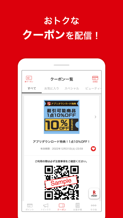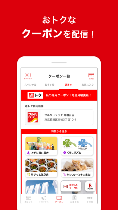 買い物前にチェックしておきたい、お得なクーポンも豊富に揃っています。アプリ限定のポイント優待クーポンが配布されることもあり見逃せません。「ビューティケア」「日用品」「食品」など、カテゴリーでクーポンを探しやすくなっているのもポイントです。