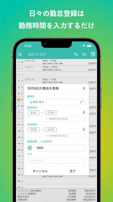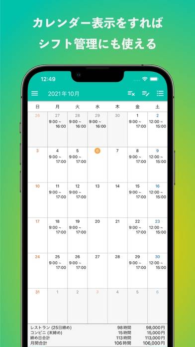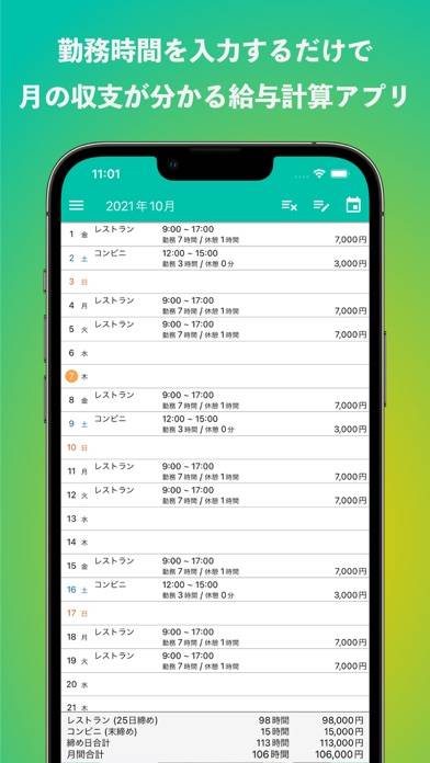 給与計算とシフト管理をまとめてできるアプリです。勤務時間を入力するだけで、月の収支を自動で計算。支払い対象時間を1分単位で設定することで、正確な給与が分かります。