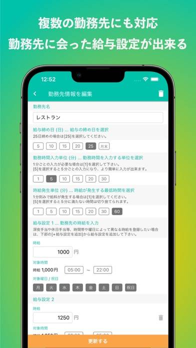 勤務先を複数登録できるため、ダブルワークをしている人に便利です。時給は時間や曜日別で設定でき、さらに支払い対象時間の登録も可能。勤務先の形態に合わせた設定ができるので、給与の計算がスムーズでしょう。