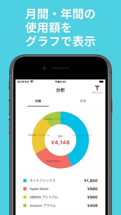 サブスク料金や固定費を簡単管理でき、出費状況が把握できるアプリです。月額・年額プランを一覧表示し、支払い通知でリマインド。忙しい日々でも簡単にお得にサブスクライフを送りましょう。