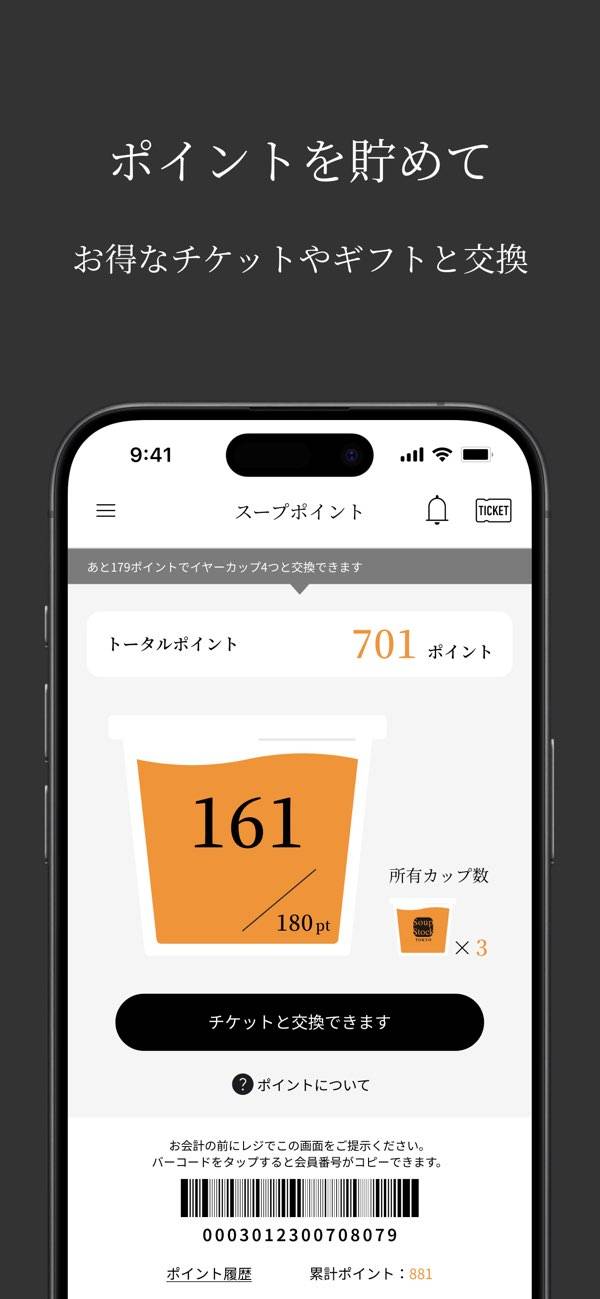 スマホひとつで「Soup Stock Tokyo」ポイントを貯めて管理できるアプリ。会員登録を行うとポイントカードが発行され、バーコードの提示とポイントのチェックが可能になります。