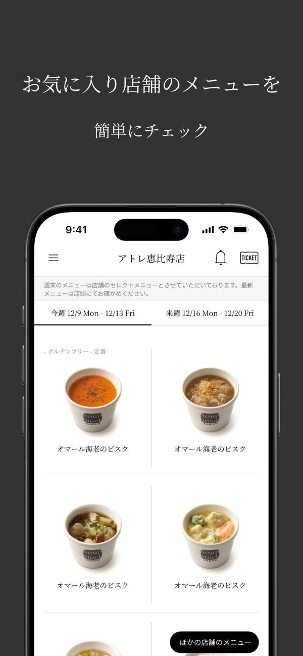このアプリではお気に入りの店舗の週替りメニューがわかります。翌週のメニューも事前に把握できるので、限定スープを逃さず計画的にお店を訪問できるしょう。次にどのスープを味わおうか考えることで、毎週の楽しみが増えますね。