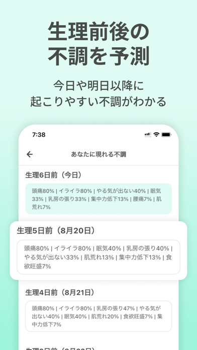 排卵期、生理中など、周期ごとの過ごし方のアドバイスが読めます。症状や心の状態の傾向がわかるので、対策を練るのにに役立つでしょう。痩せやすい時期もわかるので、ダイエットをしている人はチェックしておくといいですよ。