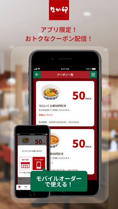 • なか卯の最新情報をチェックできる公式アプリ。新メニューを見逃さない