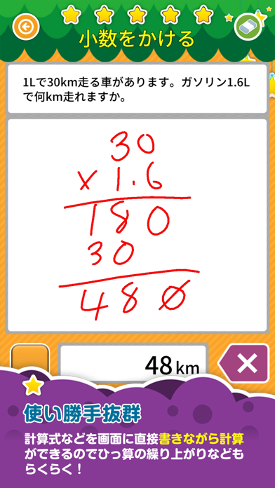 小学5年生の算数を、すきま時間に練習する学習アプリです。小数のかけ算や平均などを、難しさを選びながら確認問題でチャレンジします。手書きで筆算にも対応しており、移動中でも紙のドリル感覚で学習を進められる設計です。