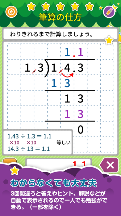 小数のかけ算や平均など、授業で扱うテーマを選んで学習しましょう。問題には難易度の段階があり、基本の確認から少しずつレベルを上げて進んでいくのが特徴。手書きの筆算に対応しているため、途中式を書きながら考え方を整理でき、計算の理解を深められます。