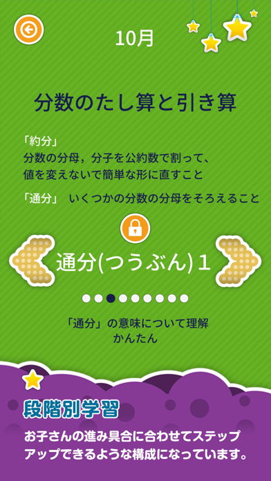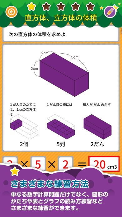 小学5年生向けの内容を、単元ごとに小分けで練習します。まずは問題に取り組み、つまずいたところは解説で考え方を確認。慣れてきたら自分のペースで学習を進められるため、家では親子で見直し、外出先では1人で短時間学習するといった使い分けもしやすくなっています。