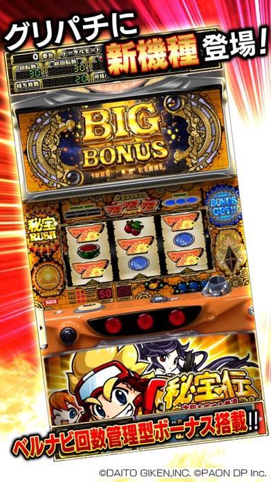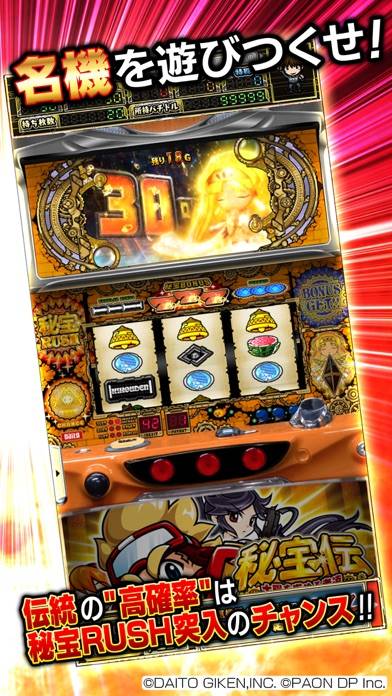 本アプリは秘宝伝の太陽を求める者達で遊べます。メダルが無くなっても、50回転までなら自動でメダルを追加。実機の液晶画面を拡大したり、周りのUIを非表示にすることで演出がより見やすくなります。