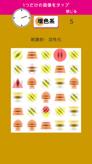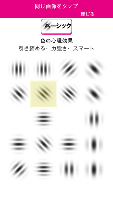 視力回復が見込める、ガボール変換画像を使ったゲームアプリです。黒くボヤッとした画像が並ぶなか、同じ絵柄のものを選ぶだけの簡単なルール。ほかにもガボール変換画像の神経衰弱などで遊べます。