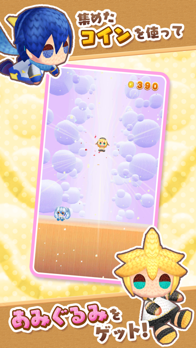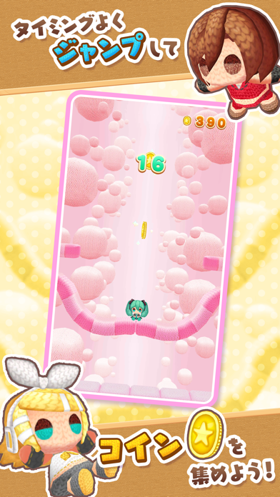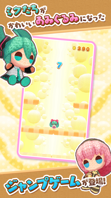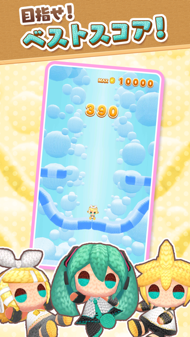 出現する足場に合わせてジャンプ。ワンタップで遊べるシンプルルール。あみぐるみになったミクがぴょんぴょんとかわいらしく跳ねる姿を堪能しながら、気軽にハイスコアにチャレンジしてみましょう。