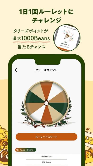1日1回ポイントがもらえるタリーズルーレットを回せます。最大1,000Beans(ポイント)が当たるチャンス。ポイントが貯まったら特典と交換できるので、毎日チャレンジしてみましょう。