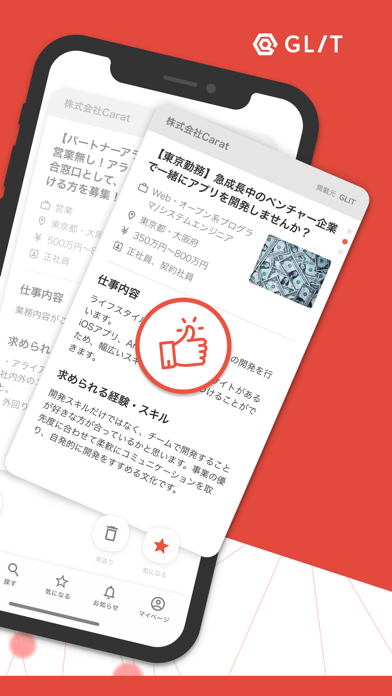 あなたの経験やキャリア、そして希望条件などをもとに求人の提案をしてくれます。さらに、求人情報だけでなく相性の良い求人サイトも自動で選んでくれるのが嬉しいところ。表示された求人を右にフリックでお気に入り、左にフリックで見送りとカジュアルに転職先を探せます。