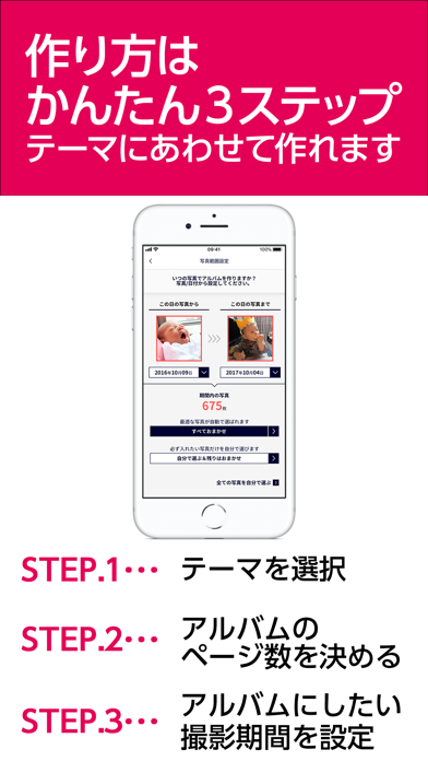 本アプリでは、AIが自動で写真を選び、レイアウトしてくれます。そのため、フォトブックに載せたい期間を指定するだけで、簡単に作れちゃいます。フォトブックが作成される間は、どんな写真が選ばれて、どんな並びになるのかワクワクしますよ。