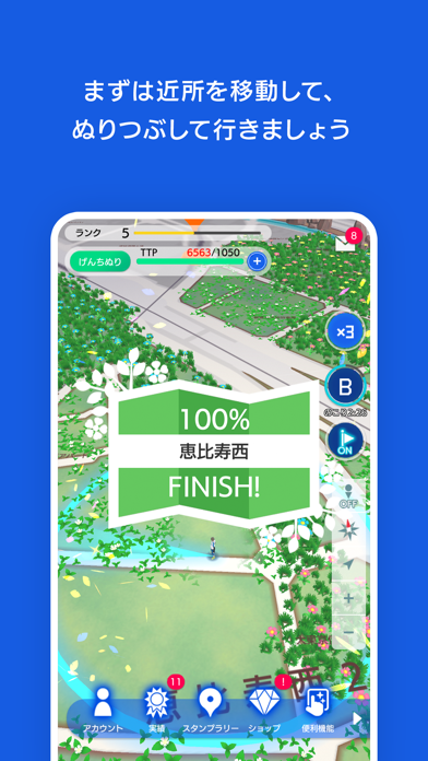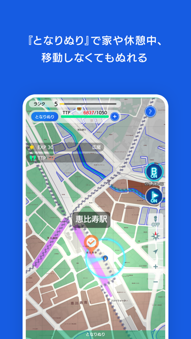 ▲地図を塗って経験値を獲得。ランクUPすると”TTP”の最大量が増えて、「となりぬり」の範囲が拡大。