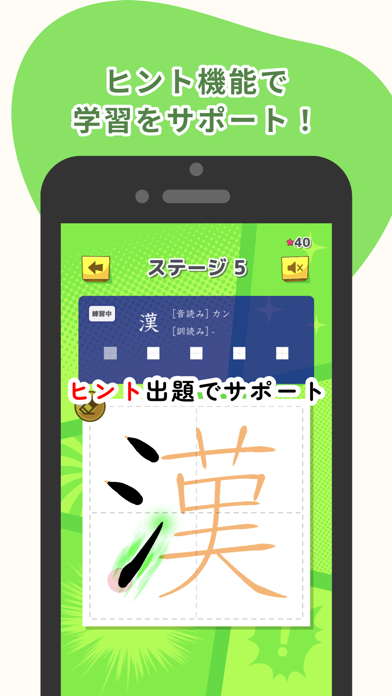 わからなければヒントボタンがあるので知らない漢字も練習できます。