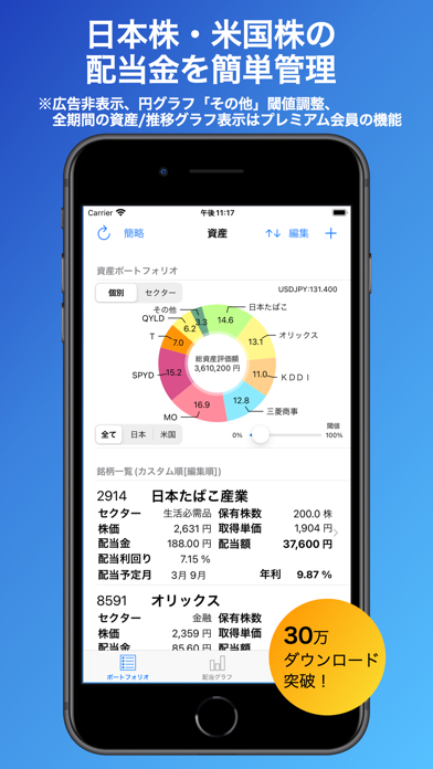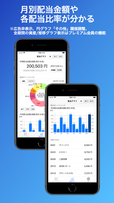 - 保有株と配当金の詳細をグラフで視覚化。銘柄比率も瞬時に把握