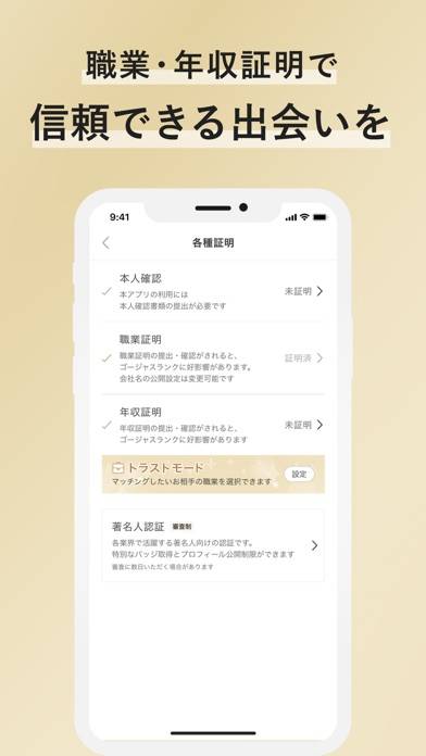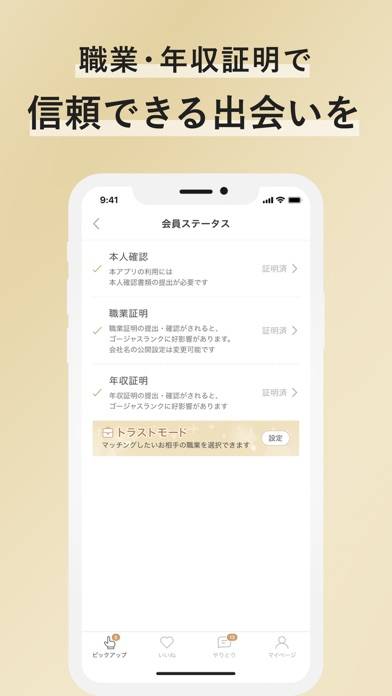 アプリ利用状況や人気度によって会員を5段階でランク付けされます。これにより、真剣に出会いを探している、安心して出会える相手をひと目で判別可能。また、本人確認・職業証明・年収証明の提出状況もわかるため、相手が偽っていないかを判断しやすいです。