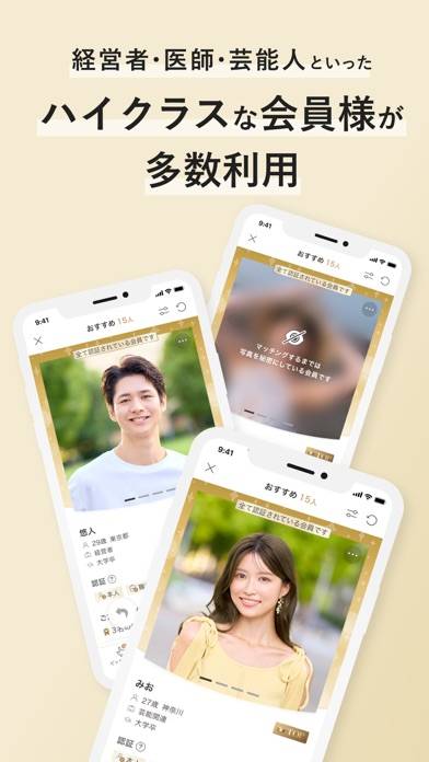 - 厳しい審査を通過したハイクラスな相手との出会いを楽しめる