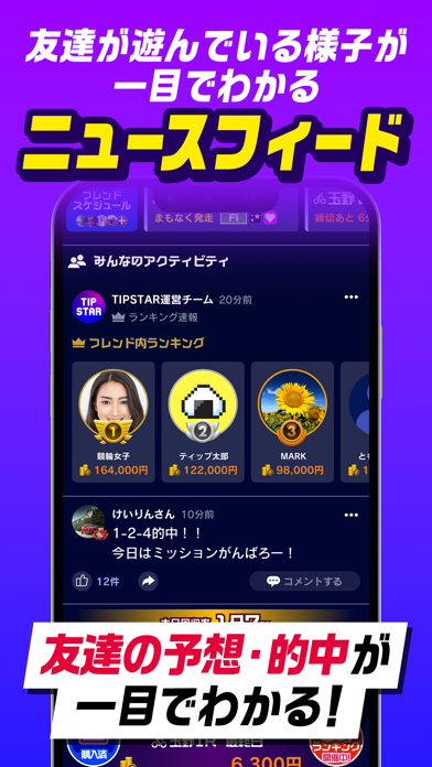 SNSのように近況を報告し合う「フィード」も搭載されています。投票に対するコメントが見られるほか、多額の払戻金をひと目で見つけられる特別仕様。純粋な交流のみならず、予想の信頼性の高いユーザーを探すのに一役買ってくれるかもしれません。