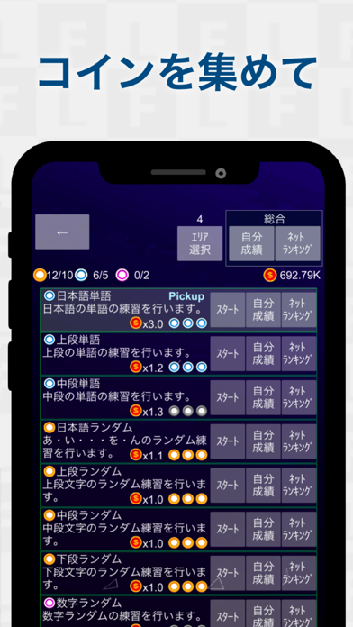 日本語の単語のほか、五十音がひとつずつ出現するエリアがあります。さまざまなエリアをクリアし、コインを貯めることで「エリア選択」から次のレベルへ移動可能。どんどんフリックの技術を高められます。