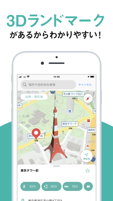 3Dのランドマーク表示で、今いる場所をすぐに確認できます。ルート案内を開始するとマップが3D表示されるのに加え、目印となるお店や施設を強調表示。目的地マーカーにより自分が向いている方向が分かるため、万が一ルートをはずれても迷いません。