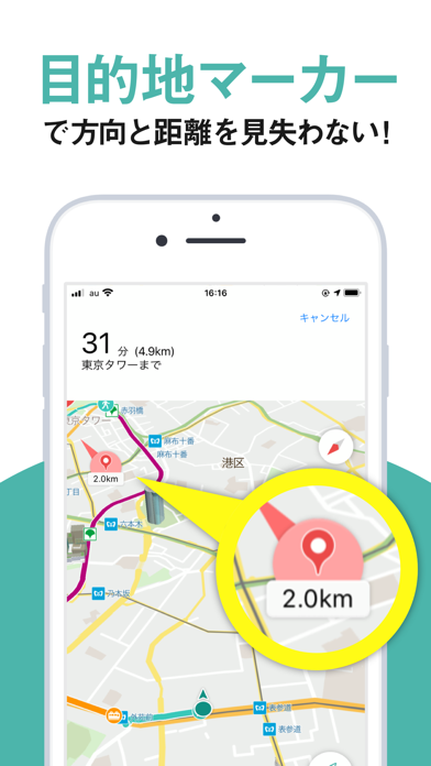 - 目的地までの距離と方向を指し示すマーカーがあるため、道に迷いにくい