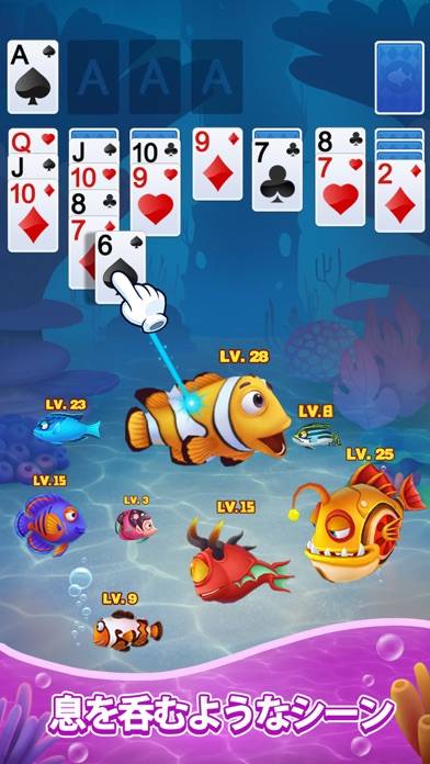 クラッシックなルールのソリティアが楽しめる本作。クリア時に獲得できる経験値とコインを使って、自分だけのアクアリウム制作を堪能することができます。ゲームの背景が水槽になっているので、魚を購入すると自由に泳ぎ回る姿を鑑賞できるようになりますよ。