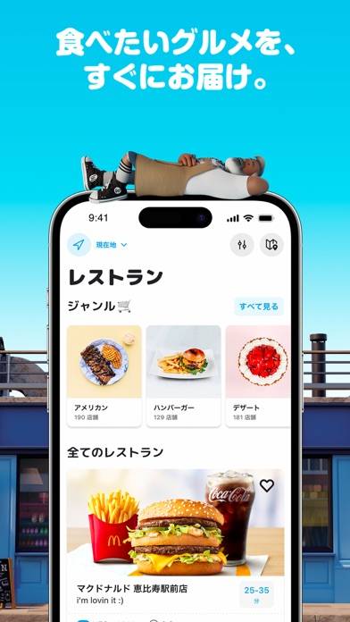 位置情報を使って周辺のレストランの情報をキャッチできます。配送料無料の店舗もあるので、お店に行くのと変わらない値段でデリバリーしてくれます。また料理ごとに目安となる所要時間が書かれているのも嬉しいポイント。料理以外にもコスメや日用品のお買い物にも対応しています!