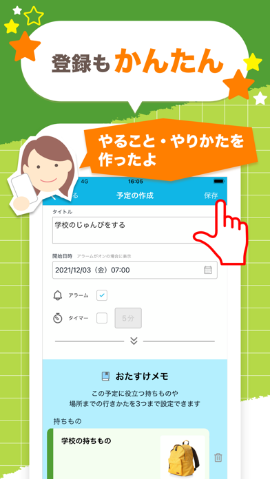 子供の「困りごと」を解決するアシストメモアプリ。小学校から電車通学をしたり、お留守番をさせたりと、親のいない場面でも「やり方」を登録することで子供が確認しながら悩み事を解決できます。