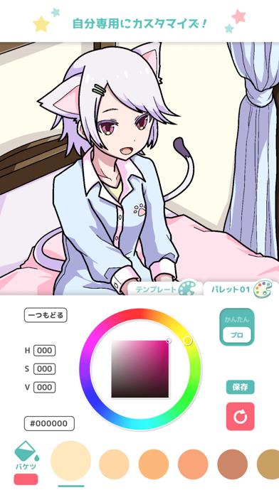 バケツでべた塗り、またはブラシで手塗りができます。色はパレットから選択でき、肌や髪用のテンプレートパレットが用意されています。はみ出しをOFFにすると、線画から色がはみ出すことなく塗れるのでとても快適。ストレス無く楽しめるところが魅力です。