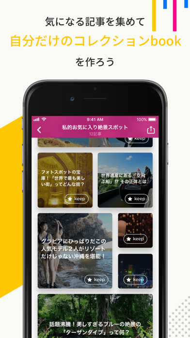 気になった記事をkeepして、自分だけの「book」を作れます。「book」はオリジナルのタイトルをつけたり、色分けしたりして管理できます。記事を自分の管理しやすいようにまとめられるので、後で見返すときにとても便利でしょう。