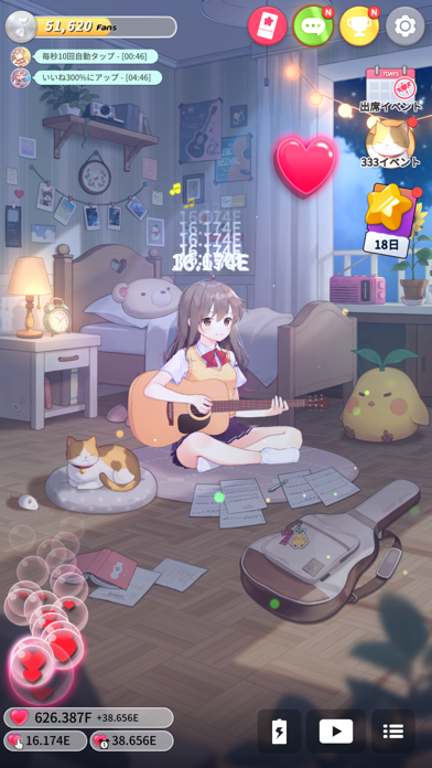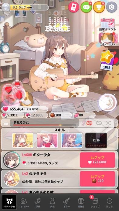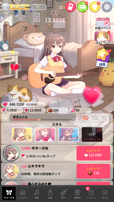 少女がギターのメロディーを奏で続ける放置&クリッカーゲームです。ギターが好きだけど恥ずかしがり屋な少女が、まずはネット配信でデビューするところからゲームがスタート。彼女のアーティスト活動を陰ながら支えてあげましょう。