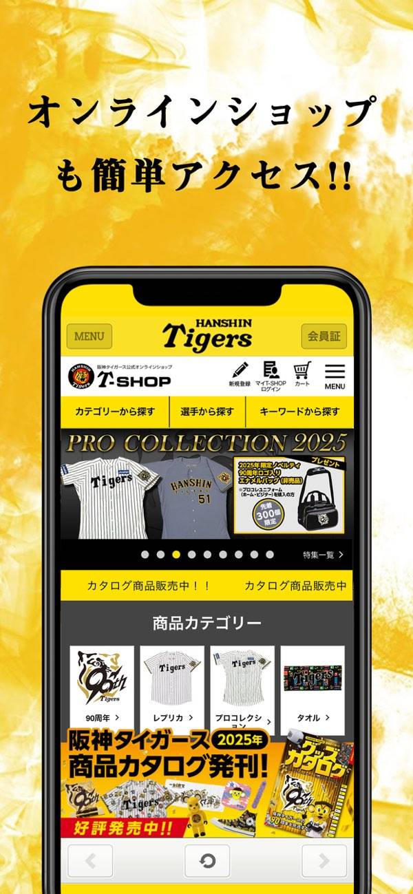 公式オンラインショップT-SHOPも本アプリから利用できます。応援グッズとしておなじみのレプリカユニフォームやタオルはもちろん、日常生活にも使える日用品のほか、オリジナルの酒類・菓子・食品も販売されています。