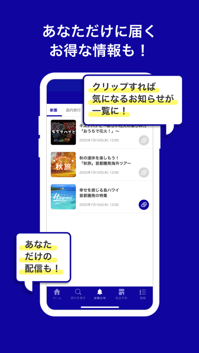 旅行がお得になる割引やセール情報が配信されています。時間と場所を選ばずスマホから手早く情報をゲットできるので、予算に優しい旅行を手配しやすいでしょう。通知機能を搭載しているため、お得な情報を見逃す心配もありません。