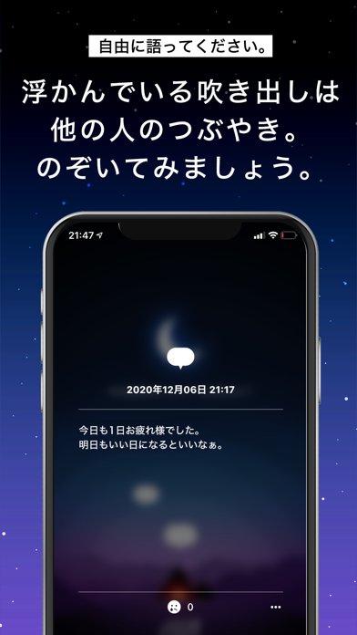 日々の疲れから癒やされるためのSNSアプリ。匿名でつぶやくスタイルを採用し、ユーザー同士の交流は必要最低限に抑えられています。誰かと会話することはなく、自分の日記を気軽に残すことができるのが魅力です。