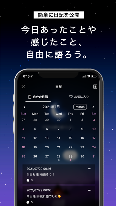 本アプリにはコメント機能は一切ありません。日記に共感したら、その感情を「いいね」ボタンで伝えるだけ。ユーザーは誰のことも気にせず、自分の気持ちを素直に書ける環境が整っています。
