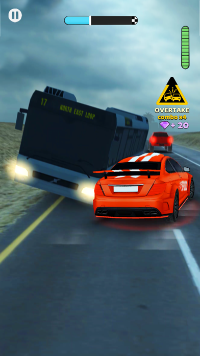 危険運転と安全運転の緩急が独自の緊張感を生み出すレースゲームです。指を離した状態だと車列に沿って安全運転、画面ホールドで急加速して追い越しという操作性になっており、対向車にぶつからないよう注意しつつ、なるべく速くゴールを目指していきます。
