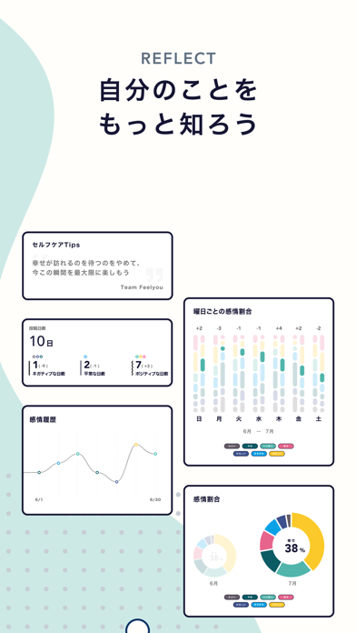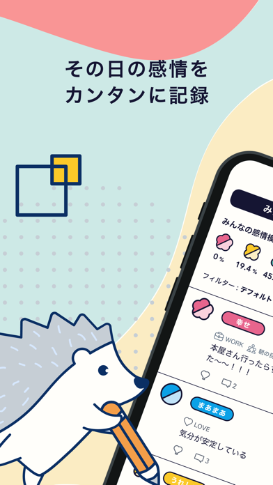 自分の感情を手軽に記録し、ほかの人と共有できるアプリ。7種類の感情から選択して投稿し、自己理解を深めます。同じテーマを持つコミュニティに参加すれば、わかり合える人に出会えるでしょう。感情を落ち着かせたい人や、共感を求める人におすすめです。
