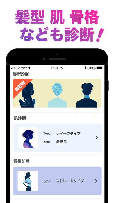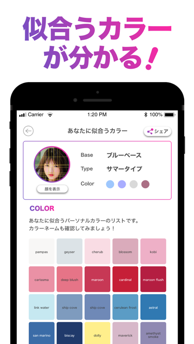 顔のパーツがどのくらい黄金比に近いかをランクで評価してくれるアプリ。かわいらしい顔か大人っぽい顔か、また芸能人では誰に似ているかも教えてくれます。パーソナルカラーを判定でき、似合う色がわかります。