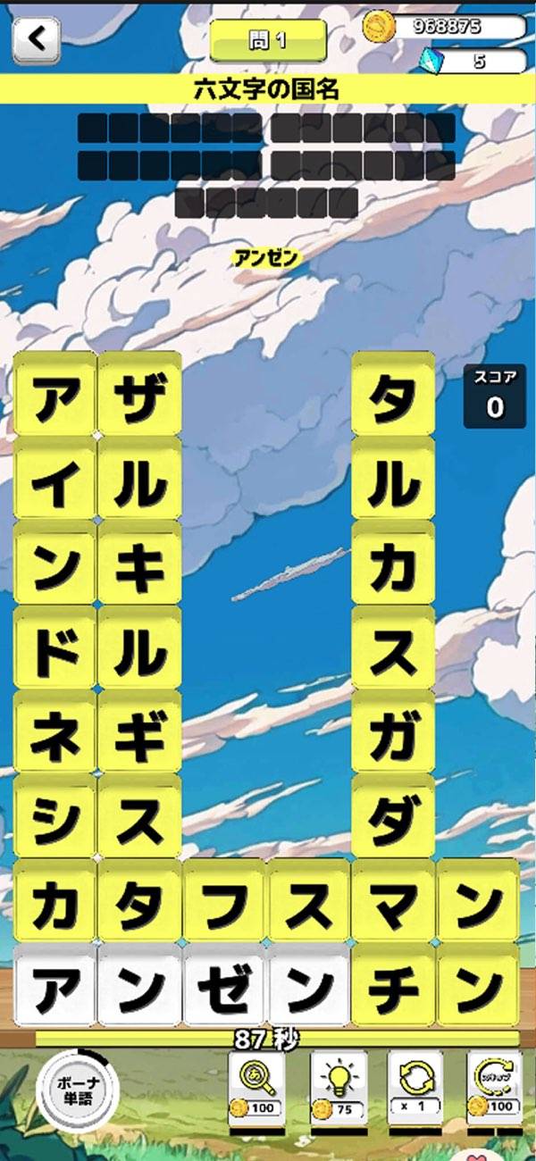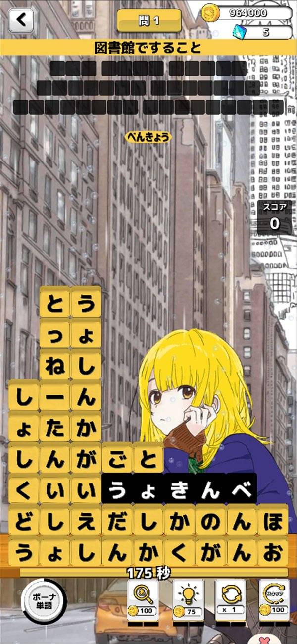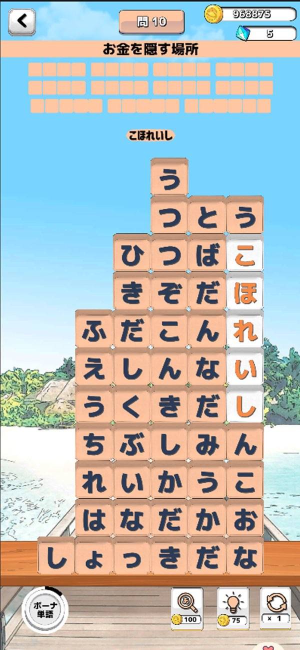 - 解答にない単語を見つけるとボーナスカウント。コインをGETできる