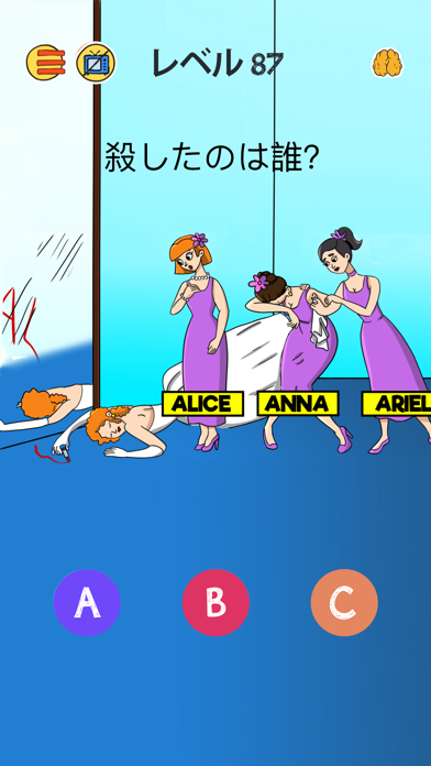 遊び方はとても簡単。例えば「エイドリアンの彼女は誰?」という問題では、2人の女性が画面に表示されているので、イラストから証拠をタップで見つけ出し答えていきましょう。頭を柔らかくしないと解けないような問題が多いので、脳トレにもおすすめですよ。