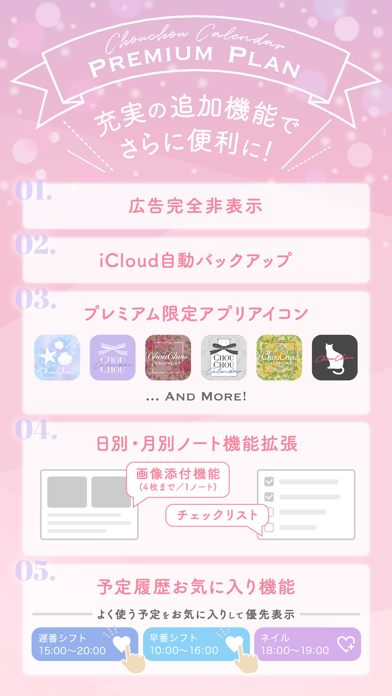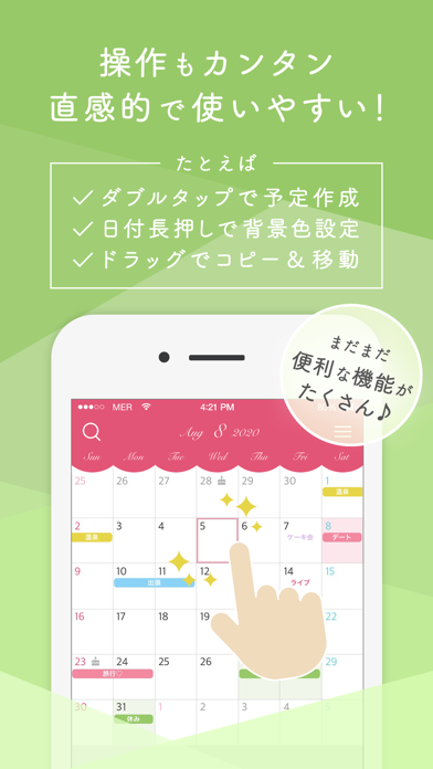 日付のダブルタップで予定作成、ドラッグで予定の移動など直感的な操作ができます。バックアップやパスコード機能もあり、セキュリティや安全性もバッチリ。使いやすさが追求されたデザインで、毎日のスケジュール管理がしやすいです。