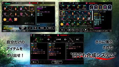 フルオートで進行するダンジョンRPG。1回のプレイで進む階層は自由に決められ、また操作も必要ないので、スキマ時間に気軽に遊べますよ。キャラクターの強化もカンタンで、アイテムはどんなもの同士でも合成可能。合成すれば効果も引き継がれるので、装備を選ばずとも好きな効果をガンガン使えます。