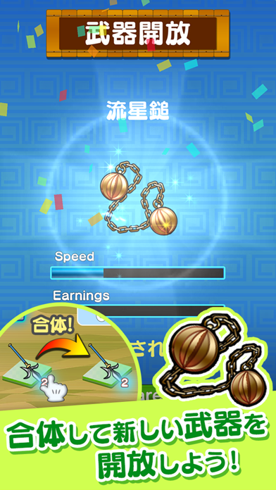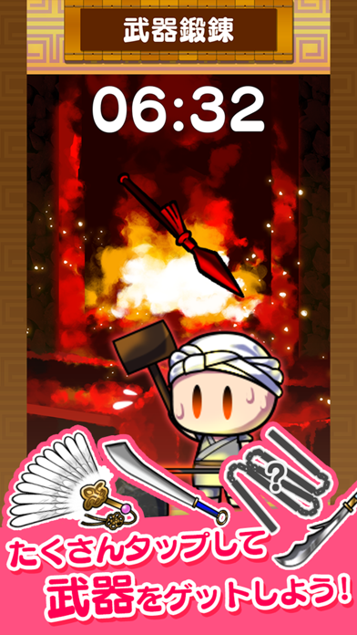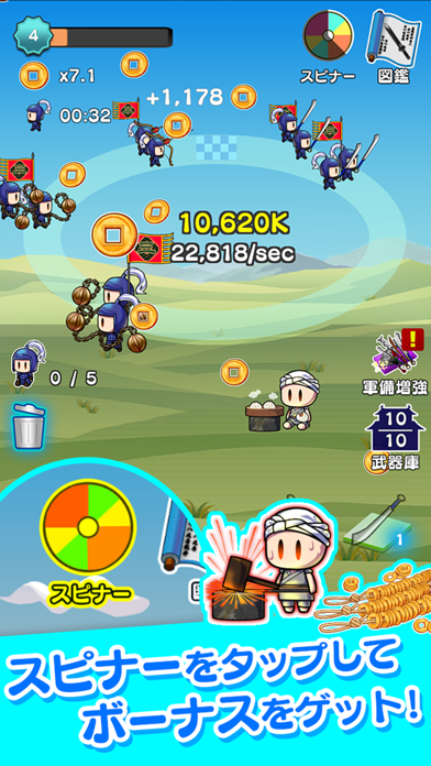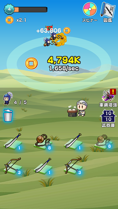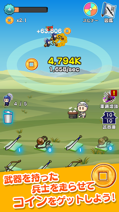 鍛冶屋がランダムで生産してくる武器を合体させて、戦場の兵士に渡していくだけのシンプルな手順で遊べる放置ゲーです。鍛冶屋をタップして生産時間の短縮が可能。軍資金が貯まっていれば、任意の武器を購入してテンポよく武器強化を進めることもできますよ。