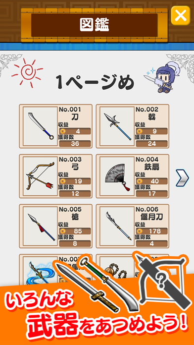 登場する武器は40種類ほど、新しく制作した武器は図鑑に登録されます。武器ごとに紹介文が書かれているので、放置ついでに読んでみるのもいいかもしれませんね。